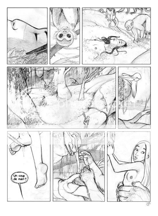 Sinon, dans la quatrième case (que je trouve magnifiquement composée), je virerais ou couperais le singe qui touche le bas de case. Il est trop entier, son corps ne devrait pas se voir autant. Mais c'est la faute à la liane qui est bizarrement intégrée et qui ne suit pas la courbure de l'arbre. Et euh... en fait, même la pose du singe est bizarre xD Parce qu'on comprend pas bien qu'il fuit le réveil de la demoiselle. (Ouais, désolé, je m'y mets fort quand je me réveille).